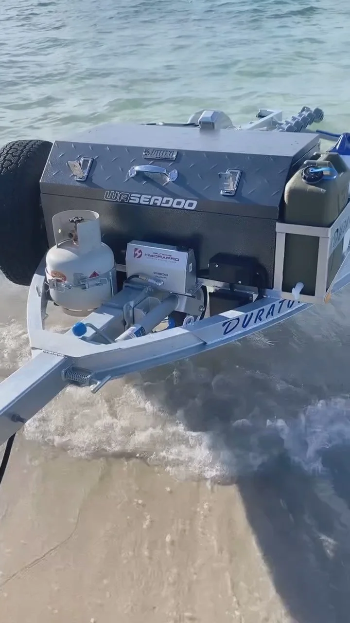Introducing the DURATOW DUAL JS SERIES: a double jet-ski trailer featuring a custom luggage rack, full-length walking platform, 2-ton rating, 14” galvanized wheels, and a sturdy hot-dip galvanized c-channel frame.